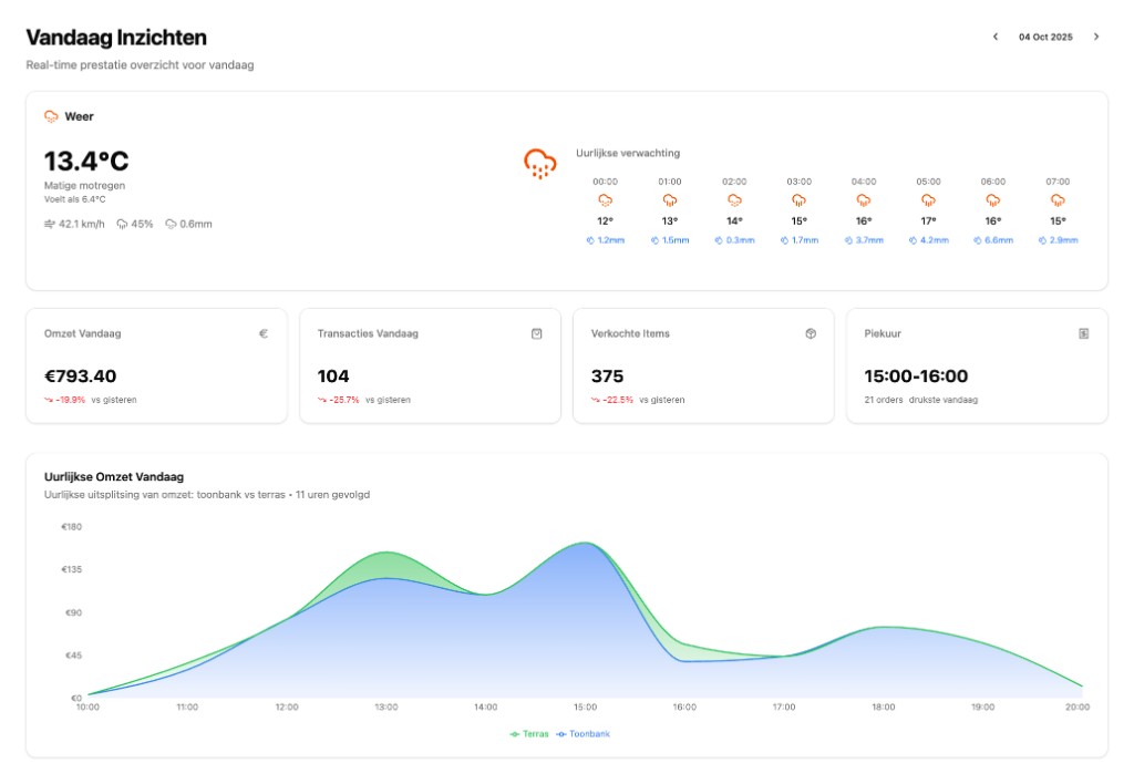 Actuele omzet, aantal transacties en verkochte items met percentage verschil ten opzichte van gisteren. Gekoppeld aan de uurlijkse weersvoorspelling met omzet per uur gesplitst in toonbank vs terras.